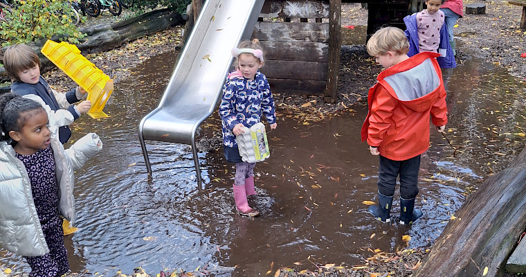 Wat een gezellig gezicht deze week: kinderen die met hun laarzen vrolijk in de grote plas op het plein staan te stampen. Even samen lachen, spetteren en genieten van de regen. Met natte laarzen maar grote glimlachen starten we de dag extra goed!