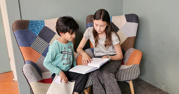 Een paar keer per week lezen de kinderen van groep 8 samen met groep 3 een boek, samen lezen is leuk!